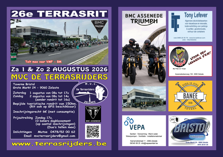 Elk jaar organiseren wij onze Terrasrit op het 1e weekend van augustus. Je wordt er vriendelijk verwelkomd op ons groot terras op de Grote Markt van Zelzate. Jullie krijgen ook een mooie toeristische bepijlde rondrit langs landelijke wegen voorgeschoteld.